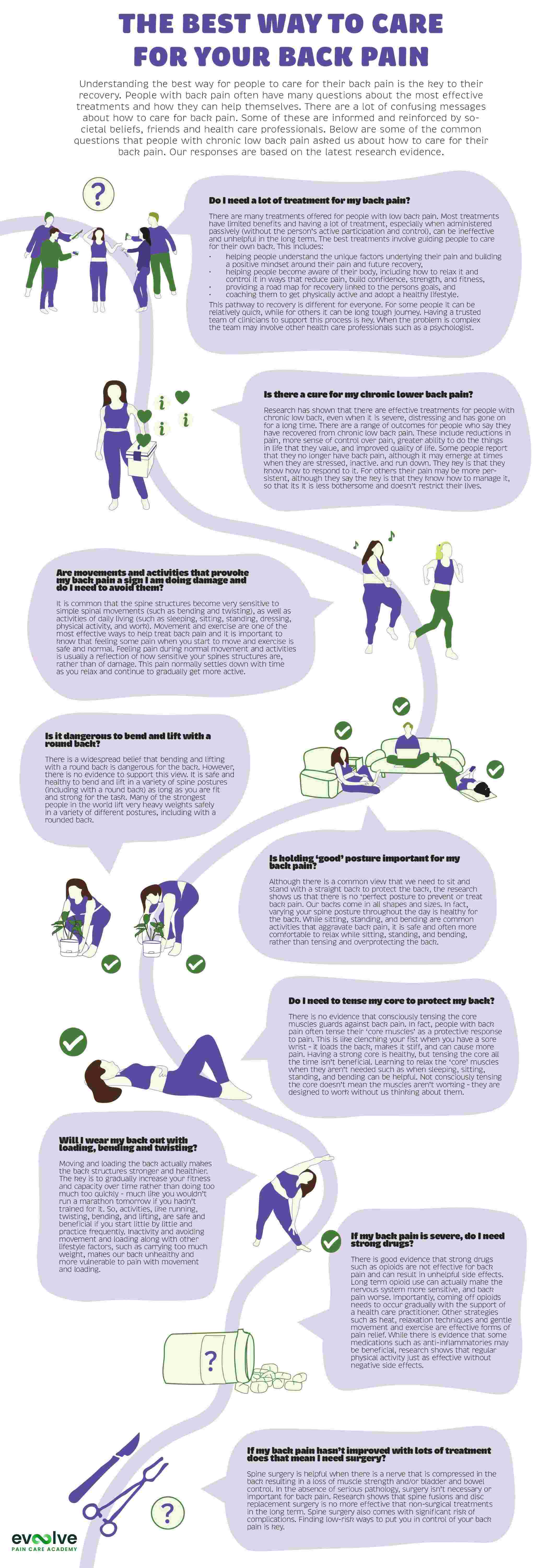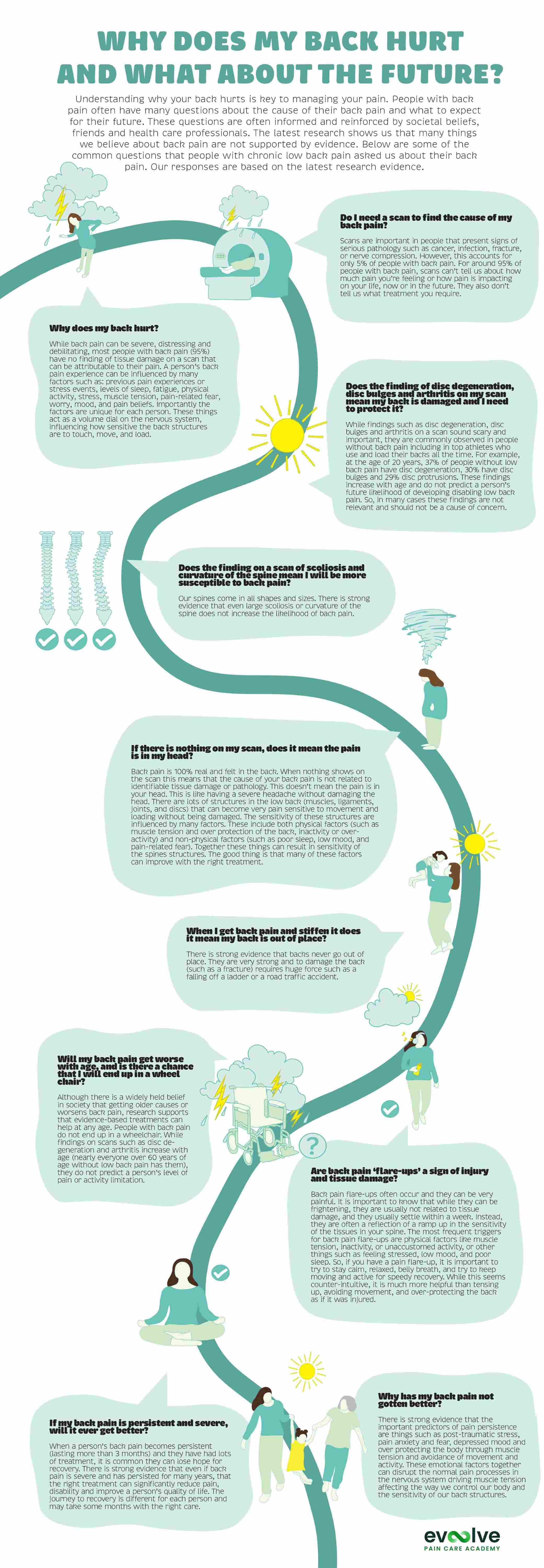 Co-designed by researchers and clinicians in partnership with people living with back pain, these infographics summarise the evidence about the most common questions asked by people with low back pain.